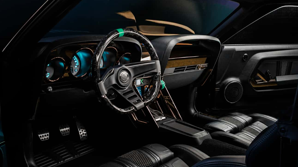 در فضای کابین با صفحه نشاندهنده ساخت Dakota Digital، سیستم تهویه Vintage Air، فرمان سفارشی، میلههای حفاظتی و قطعاتی از داشبورد که توسط چاپگر 3 بعدی تولید شده است، روبرو هستیم.